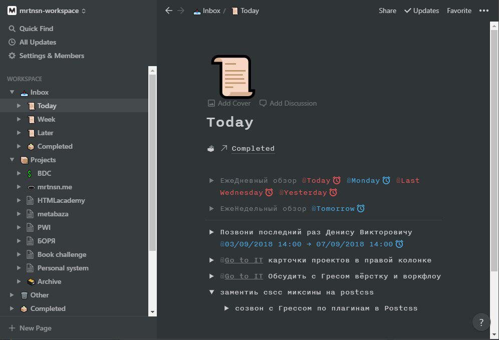 Почти готовая личная система для продуктивности. Сделана в приложения Notion. Плюсы сервиса: Минусы: В целом удобнее чем на тормозном MaxDone (последняя система была на нём). Приятно ухаживать за конструктором и постепенно улучшать его. Субъективно продуктивность выросла.