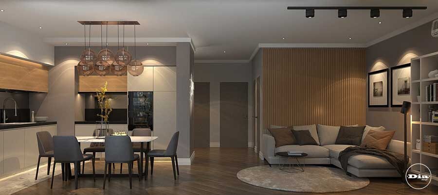 Площадь: 78 кв.м. Вид помещения: квартира Место нахождения объекта: Минск Основная идея интерьера квартиры в стиле модернизм — это комфорт и многофункциональность. Дизайн интерьера 3-х комнатной современной квартиры в Минске имеет четко разграниченную геометрию пространства, а также простой, минималистичный, но очень уютный стиль. КУХНЯ-ГОСТИНАЯ За основу оформления просторного помещения, совместившего в себе кухню, гостиную, столовую и прихожую, дизайнер студии DIA взяла нейтральную палитру в отделке. Особое внимание она уделила многофункциональному освещению, подчеркивающему модернизм: точечные светильники, светодиодные полосы, необычная люстра в зоне кухни и футуристическая композиция в виде кубов на стене на входе в помещение. Украшает интерьер гостиной также богатый текстиль на диване, открытый стеллаж с ассиметричными полками, журнальный столик на тонких металлических ножках и, конечно, деревянные рейки на стене, повторяющие фактуру верхнего ряда шкафчиков на кухне. Дизайн 3-х от