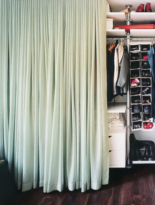Проблема хранения вещей актуальна для всех, а оборудование полноценной гардеробной комнаты – мечта, доступная далеко не каждому. Тем более, в классическом понимании это должно быть помещение, огражденное стеной или перегородкой. Организовать хранение одежды и обуви можно различными способами, и один из них — сделать полноценную гардеробную комнату, посредством обычной шторы. Удобно.Гардеробная со шторкой вместо двери — хорошее решение для небольшой комнаты. Если Вам не хочется прямо сейчас наводить порядок в вещах или Вы желаете вообще скрыть эту зону от чужих глаз, можно просто задернуть штору. В остальное же время гардеробную можно держать открытой, что визуально сделает комнату более просторной, а шторка останется в качестве аксессуара. Экономно.Также это хорошая возможность сэкономить — заказать шкаф-купе или сделать двери гардеробной под заказ намного дороже, чем повесить шторку. Особенно это актуально при нестандартной планировке, скажем, если Вы решили оборудовать гардеробную