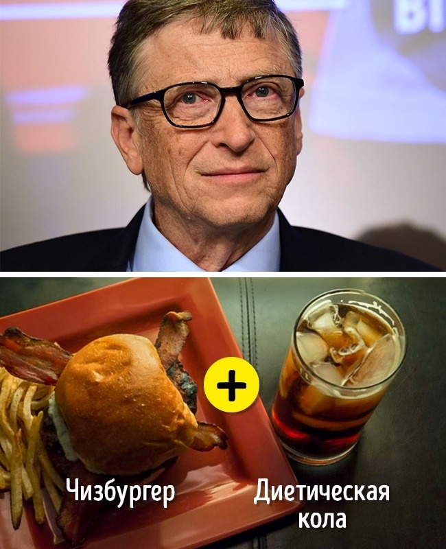 Нам кажется, что богатые и знаменитые питаются исключительно изысканными блюдами, но на деле звезды — такие же люди, как и мы. Билл Гейтс Богатейший человек на планете — настоящий фанат американского фастфуда: ежедневный обед Гейтса состоит из чизбургера или бигмака и баночки кока-колы. Несмотря на искреннюю любовь к вредным продуктам, для переговоров предприниматель выбирает японские рестораны, которые, по его мнению, положительно влияют на исход встречи. Мадонна Свою безупречную фигуру поп-дива поддерживает жесткими веганскими диетами и интенсивными кардиотренировками. Гастрономический аскетизм певицы чувствуется даже в выборе «лакомств» — сладости Мадонна заменяет свежей капустой и имбирным чаем. Стивен Кинг Обед «короля ужаса и страха» состоит из двух очень сытных продуктов — мяса и картофеля. После обеда писатель настраивается на работу за чашечкой кофе с кусочком домашнего чизкейка. Несм