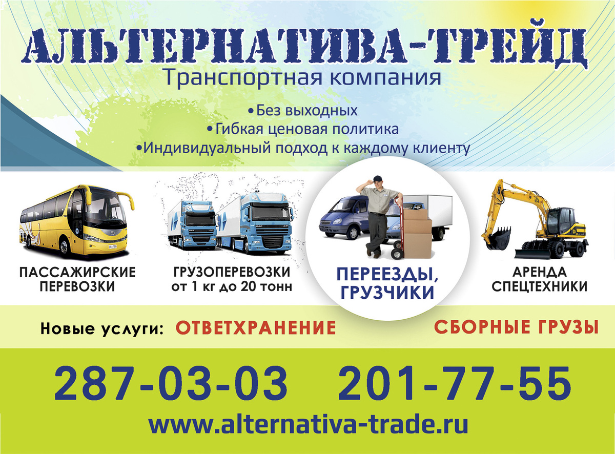 Транспортная компания Альтернатива-Трейд Пассажирские перевозки Грузоперевозки от 1кг до 20 тонн Переезды, грузчики Аренда спецтехники Ответхранение Сборный груз Без выходных. Гибкая ценовая политика Индивидуальный подход к каждому клиенту Тел. 287-03-03, 201-77-55 www.alternativa-trade.ru #альтернативатрейд #транспортнаякомпания #пассажирскиеперевозки #грузоперевозкиекатеринбург #переездыекатеринбург #грузчикиекатеринбург #арендаспецтехникиекатеринбург #ответхранениеекатеринбург #сборныйгрузекатеринбург #услугибург #екатеринбург