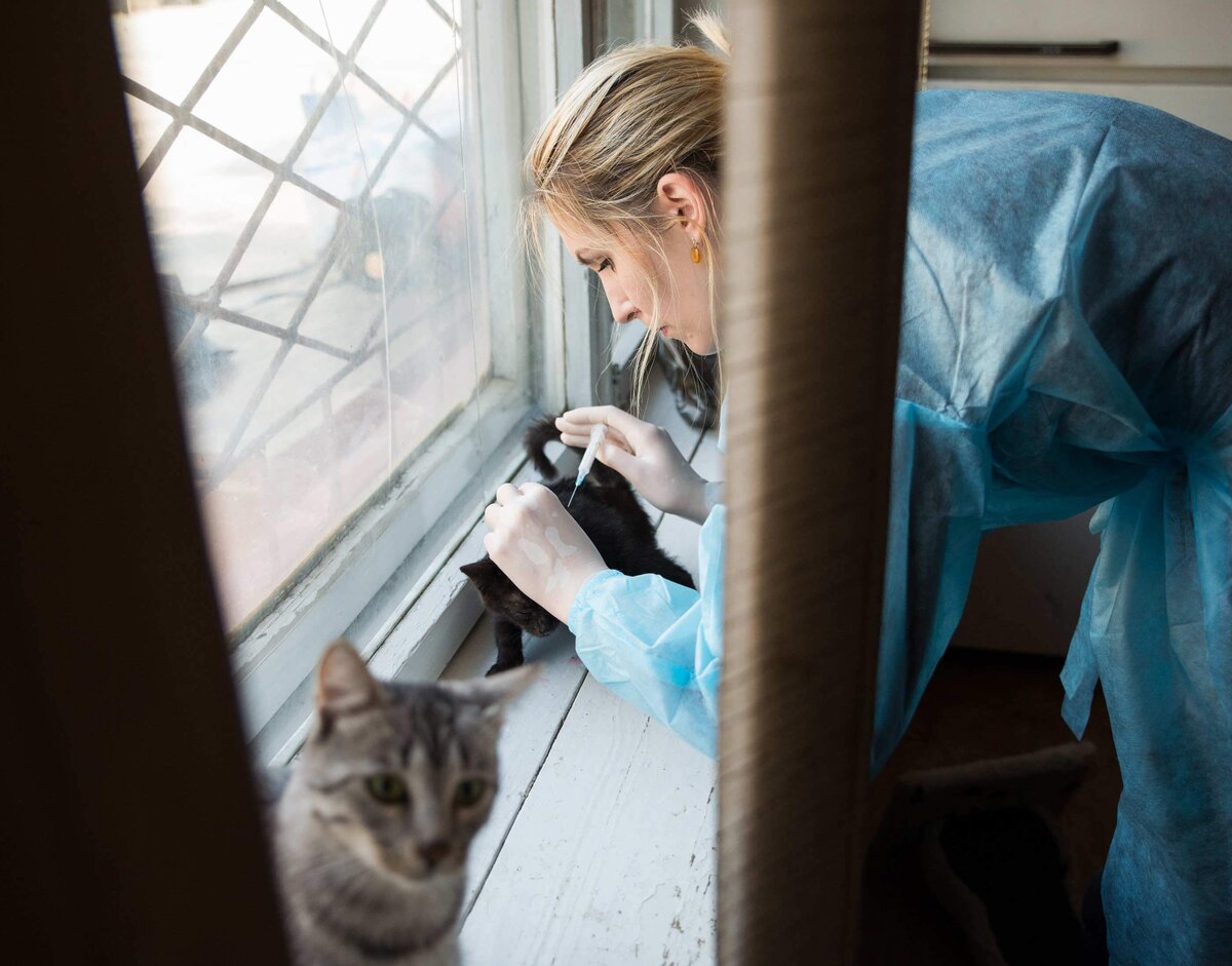 Держать котят на заводе сложно, но найти домашнюю передержку для микроспорийных животных еще сложнее. Другие волонтеры восхищаются тем, как Аниса нашла выход из ситуации и придумала место для передержки прямо на заводе. Сама же Аниса своей смекалкой не хвастается. Она накидывает халат, чтобы покормить котов и оказать им необходимую медицинскую помощь.