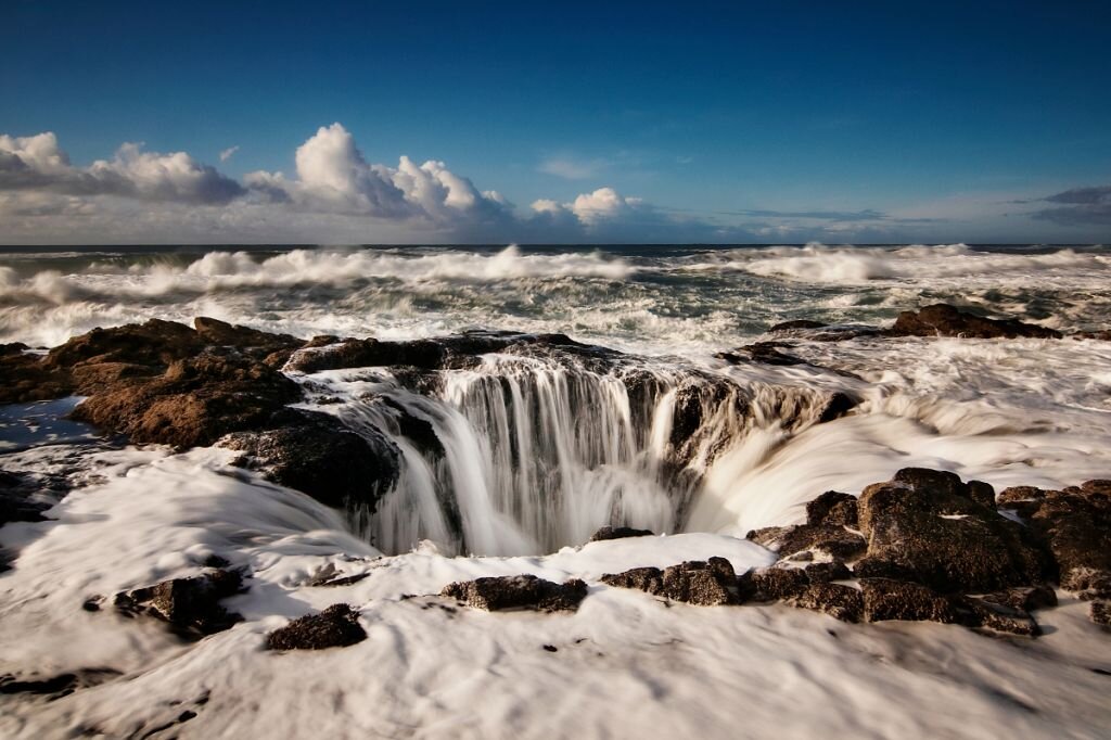 На мысе Перпетуа, штат Орегон, есть восхитительное природное явление — отверстие, которые называют колодцем Тора. Некоторые даже считают его местом входа в подземное царство. Во время прилива он наполняется, а затем резко выстреливает водной струей вверх. Высота напора составляет 6 м и напоминает настоящий гейзер. Но не для этого приезжают сюда фотографы. Самое волнительное зрелище, когда вода набегает в колодец. Это по-настоящему красивое и завораживающее зрелище, мечта каждого фотографа. Предание гласит, что на этом месте был убит в порыве ревности своей возлюбленной юноша. Тор превратил его кровь в лаву, которая прожгла землю и скрыла от людских глаз тело молодого человека под землей. Теперь это место служит напоминанием всем, как опасна и коварна бывает любовь. Колодец до сих пор не изучен. Он может быть связан огромной сетью подземных пещер. Мощное течение опасно для аквалангистов. Оно может унести вглубь недр смельчака или разбить его об выступы скал. Поэтому остается только люб
