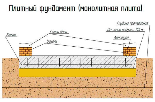 Плитный фундамент применяется на обводнённых пучинистых неоднородных грунтах. Этот тип фундамента еще называют плавающим. Он способен воспринимать подвижки грунта, предохраняя всю конструкцию дома от деформаций. Глубина заложения плитного фундамента может быть любой и не зависит от глубины промерзания. Первым этапом строительства плитного фундамента является рытье котлована необходимой глубины, с последующим выравниванием основания. По выровненному грунту засыпают песчаную подушку, выравнивают ее и тщательно трамбуют. Затем возможны два варианта дальнейших действий. В первом, более простом, поверх подушки укладывают гидроизоляцию, а затем приступают к армированию, монтажу боковой опалубки и заливке плиты. Во втором случае поверх подушки сначала заливают и выравнивают тонкий слой бетона - так называемую бетонную подготовку, в результате чего получают прочное ровное основание. По нему уже устраивают гидроизоляцию, а затем монтируют арматурный каркас, с квадратной ячейкой расчетного