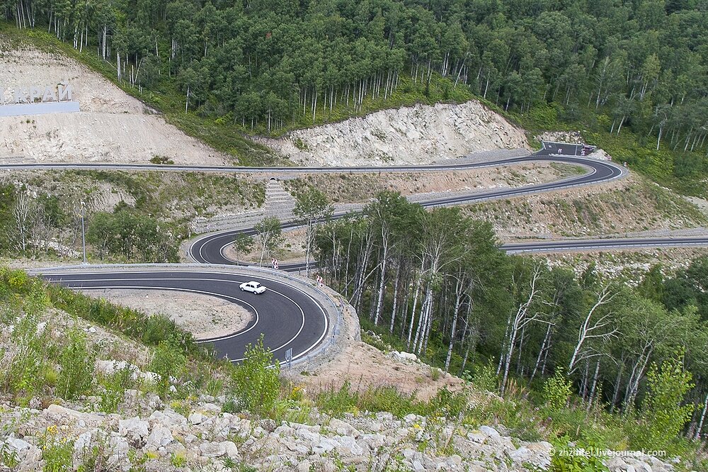 Дороги на Алтае меня удивили. Конечно, тут есть и горные грунтовки, но все основные трассы находятся в отличном состоянии. Одна из самых красивых дорог в предгорьях Алтая — серпантинная трасса, ведущая на новый развивающийся курорт «Белокуриха-2». Дорога выполнена по новейшим технологиям, по федеральной целевой программе «Развитие внутреннего и въездного туризма». Дорога через горный перевал к месту будущего курорта Белокуриха-2 официально открыта в 2015 году. Дорожники отчитались о 12 серпантинных участках на 7,7 километрах подъема дороги в сложном географическом рельефе с перепадом высот в 420 метров. Дорога украшена стелой с надписью «АЛТАЙСКИЙ КРАЙ». Высота букв — шесть метров. По официальной информации, этот горный серпантин с 62 поворотами по своей сложности превзошел знаменитый Чике-Таман в Горном Алтае. Следует отметить, что дорога прекрасно оборудована. Везде стоят отбойники, знаки подсвечиваются, энергия для этого вырабатывается ветрогенераторами и солнечными батареями. Оч