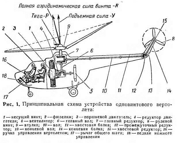 Вертолетом называется летательный аппарат тяжелее воздуха, подъемная сила которого создается одним или несколькими несущими винтами, приводимыми во вращение одной или несколькими силовыми установками (двигателями). Наиболее распространенный тип вертолета с одним винтом и поршневым двигателем состоит из следующих основных частей: несущего винта, фюзеляжа, рулевого винта и шасси. Несущий винт 1 служит для создания подъемной силы и тяги. При вращении несущего винта летчик с помощью ручки управления вертолетом 16 через автомат-перекос может изменять направление полной аэродинамической силы несущего винта R, перпендикулярной плоскости вращения концов лопастей, и тем самым создавать составляющую Р этой силы, направленную по касательной к траектории полета. Она аналогична силе тяги воздушного винта поршневого самолета или силе реакции газовой струи реактивного самолета и может меняться по величине в зависимости от угла наклона несущего винта, а следовательно, полной аэродинами