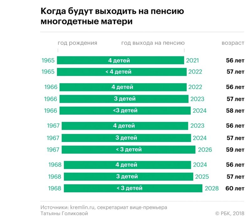 29 августа Владимир Путин выступил с телеобращением, в ходе которого поручил Правительству смягчить пенсионную реформу. Примечательно, что многие предложения Президента напрямую касаются женщин. Во-первых, пенсионный возраст для них повысится на 5 лет, а не на 8 (то есть до 60 лет, а не до 63, как это планировалось изначально). Во-вторых, Президент предложил предусмотреть новые пенсионные льготы для многодетных матерей, имеющих 3 и 4 детей. «Мы должны предусмотреть право досрочного выхода на пенсию для многодетных матерей. То есть если у женщины 3 детей, то она сможет выйти на пенсию на 3 года раньше срока. Если 4 детей — на 4 года раньше», — заявил Владимир Путин в своем телевизионном обращении к гражданам РФ 29.08.2018 г. В такой формулировке это предложение оставляет много неопределенностей, если принять во внимание другие обстоятельства. Уже известно, что повышение пенсионного возраста начнется с 2019 года, однако делаться это будет поэтапно — ежегодно на 1 год в течение 5 лет (с 2
