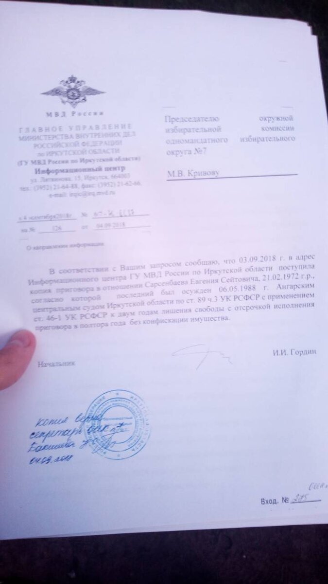 В распоряжение портала попал интересный документ (на фото). В нём за подписью начальника информационного центра ГУ МВД России по Иркутской области сообщается, что 03.09.2018 поступила копия приговора в отношении Сарсенбаева Евгения Сейтовича. Согласно документу гражданин Сарсенбаев был осуждён 06.05.1988 года Ангарским центральным судом Иркутской области по статье 89 ч.3 УК РСФСР к двум годам лишения свободы. Таким образом данные, поданные кандидатом от КПРФ являются недостоверными. Отметим также, что кража с проникновением согластно Уголовного Кодекса РСФСР являелтся преступлением против социалистической собственности. Получается, что краснознамённые товарищи, борющиеся за социализм в отдельно взятой Иркутской области открыто поддерживают расхитителя социалистических благ. Также вызывает вопрос как и кем проверялись данные о товарище Сарсенбаеве, что факт судимости удалось документально подтвердить лишь в 2018 году. Напомним ранее Евгений Сейтович уже баллотировался и был кандидатом