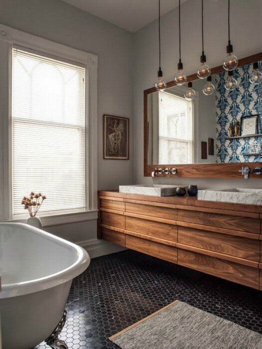 Владельцы просторных ванных комнат – невероятные счастливчики! Единственная задача для них – грамотно распорядиться пространством. Самый главный этап оборудования – это планировка. Определите для себя, что бы Вы хотели видеть в своей ванной – не отказывайте себе ни в чем, ведь площадь позволяет! К примеру, Вы можете установить и ванну, и отдельный душ. При создании интерьера большой ванной важно придерживаться симметрии. Разумеется, это не обязательно, но таким образом выстраивается более элегантное и продуманное оформление комнаты. Добиться эффекта симметрии можно, установив два умывальника – это не только красиво и дорого смотрится, но и очень удобно, если в доме живет, как минимум, двое взрослых. Чтобы ванная выглядела поистине роскошно, не оставляйте центр комнаты пустым. Заполните его чем угодно: пусть это будет красивый табурет с банными принадлежностями, комнатное большое растение, небольшой элегантный столик или хотя бы напольная ваза. Ваша задача – сделать пространство запол
