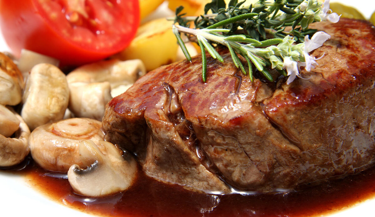 Ингредиенты, г Бифштекс фаршированный п/ф — 1 шт./240 Гарнир из запеченной сливы и абрикосов п/ф — 100 Соус коньячный п/ф — 40 Помидор сушеный — 1 шт. Чипс яблочный — 1 шт. Розмарин (веточка) — 1шт. Бифштекс фаршированный п/ф (на 240 г) Говядина мраморная (вырезка) — 200 Масло сливочное топленое — 60 Грибы шиитаке — 30 Грибы лисички — 30 Лук речатый пассерованный — 15 Крепин — 25 Гарнир из запеченной сливы и абрикосов п/ф (на 100 г) Слива свежая — 1 шт./100 Корица молотая — 1 Пудра сахарная — 2 Абрикосы консервированные — 80 Перец душистый молотый — 1 Соус коньячный п/ф (на 40 г) Лук-шалот — 20 Масло сливочное топленое — 15 Перец зеленый — 3 Коньяк — 20 Демиглас — 100 Соль — по вкусу Перец черный молотый — по вкусу Чипс яблочный п/ф (на 1 шт.) Яблоко «Гренни смит» — 30 Сахар — 10 Вода — 30 Технология приготовления и оформления блюда Выложить на тарелку фаршированный бифштекс. Рядом разместить гарнир из запеченной сливы и абрикосов. Полить бифштекс коньячным соусом. Украсить блю