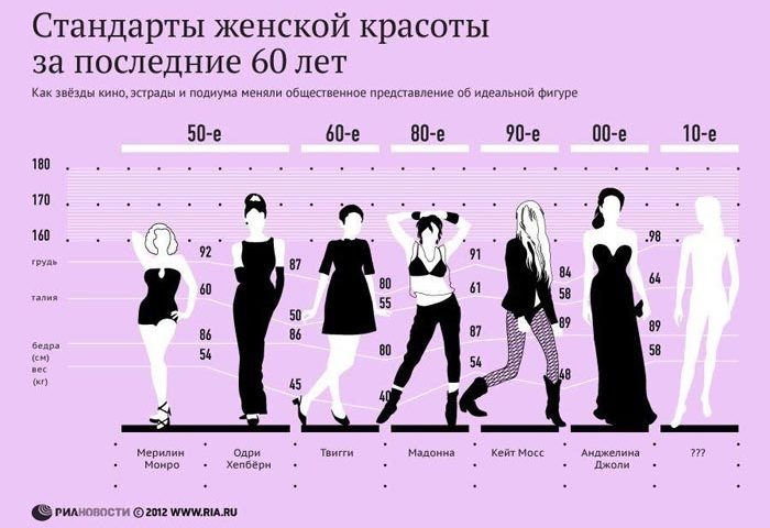 Как менялись идеалы красоты во второй половине XX века? Каковы тенденции сегодня, и что нам ожидать от дня завтрашнего? В прошлой публикации мы обсуждали изменения во взглядах на идеальные женские фигуры в первой половине двадцатого столетия. Сегодня мы рассмотрим тенденции, начиная с 1960-х годов и заканчивая сегодняшним днем. Также попробую предугадать, какими будут иконы красоты и стиля в ближайшем будущем. 1960-е. Как мальчик-подросток В 60-е женщины рьяно отстаивали свои права, в том числе право носить короткие платья и юбки. Иконой стиля тогда стала Твигги, она же британская модель Лесли Хорнби. Худощавая, ее вес колебался в районе отметки в 40 кг, похожая на мальчика, в коротких платьях, Твигги породила новую моду. В Америке в то же время появилось очень много хиппи — «детей цветов». Свободные платья и юбки, разноцветные балахоны с символикой, раскрашенные джинсы и худощавые девушки. Подобная внешность объяснялась «свободной» жизнью на улице, постоянными перемещениями и употре