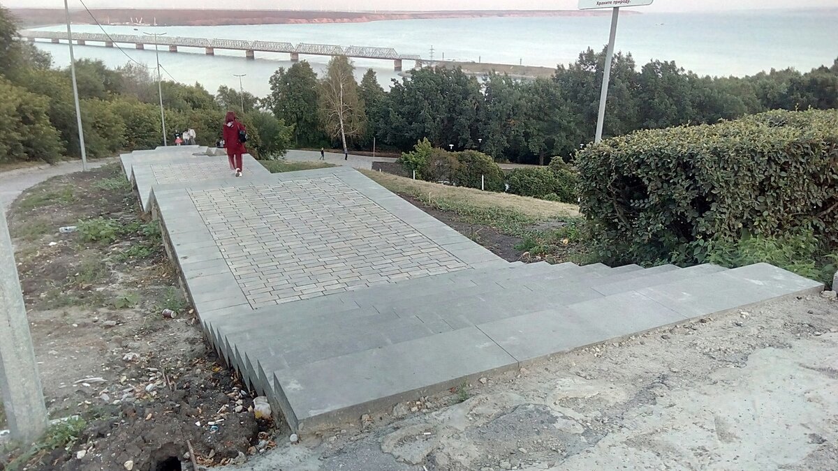 Реконструкционная суета на территории парка Дружбы народов улеглась. Судя по тому, что с реконструируемой площадки исчезли строительные материалы, рабочие и техника - работы завершены. Потребовалось на все про все ни много ни мало полтора года времени и 40 миллионов бюджетных рублей. Такими видами встречает обновленное общественное пространство в центре города жителей Ульяновска и туристов: Лестница, ведущая в парк. Кажется, про перила просто забыли. То ли они не были предусмотрены проектом, то ли просто не хватило денег. Хотя, может оно и к лучшему, потому как спустившись вниз выясняется, что фонари, установленные вдоль аллей, никак не закреплены, а лишь слегка присыпаны землей, и в буквальном смысле дрожат как осина на ветру. Перила, закрепленные таким же образом, были бы еще более опасны, чем их отсутствие. Дорожка сбоку от лестницы, по мнению инженеров, осуществляющих реализацию проекта, и так достаточно благоустроенна и в дополнительных девайсах не нуждается. Оползень на скло