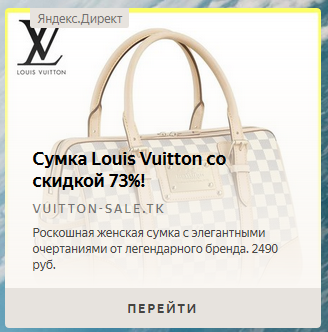 Предыдущая часть Продолжаю рубрику мошенники в Яндекс.Директе. Снова сумка, только на этот раз Луи Витон тоже за 2490 переходим на сайт и видим уже знакомое оформление, только сумка другая. То же кошелек (только от Луи Витон) и помада в подарок. Листаем дальше. Даже отзывы не додумались поменять - все под копирку с предыдущего сайта. Но есть отличие в ответе на вопрос почему цены ниже, хотя бы не пишут что не платят налоги, как на сайте рассмотренном в предыдущей статье. Конечно благодаря тому, что они прямые поставщики они могут продавать сумку ценой в 40 000р за 2500 (НЕТ!). Вопросов бы к ним не было если бы честно писали, что продают копию (реплику, подделку и т.д.), но нет они утверждают, что являются прямыми поставщиками. Яндекс может уже пора начинать проверять рекламодателей??!