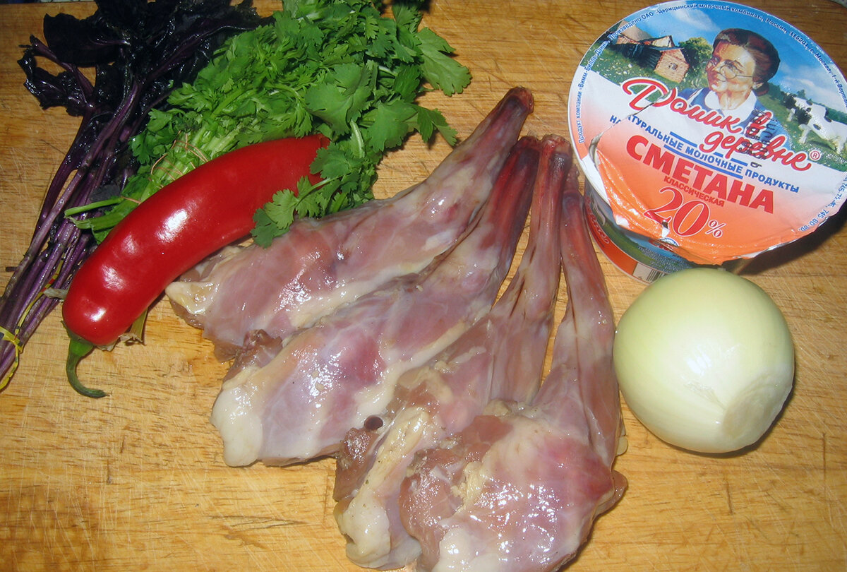 Разбирал старые рецепты, имеется ввиду рецепты, которые когда-то делал, а не старинные, и нашел «кролик в сметане». Судя по отзывам, блюдо понравилось многим. Тогда решил повторить. Сегодня кролика купить не проблема, поэтому на подготовке кролика и его разделки останавливаться не буду. Ингредиенты блюда. Кроличьи лапки
