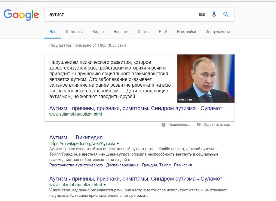 Президент России на первом месте в поиске Google по запросу "аутист" Интернет пользователи обратили внимание на странную выдачу в поисковой системе Google по запросу "аутист", так как в топе оказался Президент Российской Федерации Владимир Владимирович Путин Также на первом месте была его фотография в Google картинках После бурных обсуждений данного феномена компания Google исправила проблему И теперь Владимир Владимирович по данному запросу появляется только в картинках Будь в курсе самых трендовых новостей России Подписывайся на наш канал The Trend Of The Day