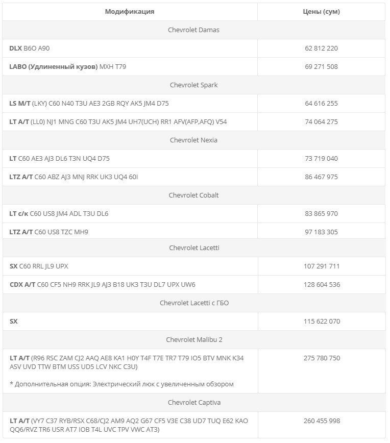 УЗБЕКСКИЕ АВТОМОБИЛИ СИЛЬНО ПОДОРОЖАЛИ GM Uzbekistan повысил цены на свои автомобили в среднем на 7,7%. Это объясняется убытками АО «Дженерал Моторс Узбекистан» и нерентабельностью производства некоторых моделей. Правда, розничные цены на популярные «Спарк», «Нексия» и «Кобальт» остались прежними. Раньше руководство компании объявляло о повышении на 15 процентов. Так что вполне возможно, что нынешний рост цен это всего лишь первый этап. Новый прейскурант с официального сайта GM Uzbekistan: