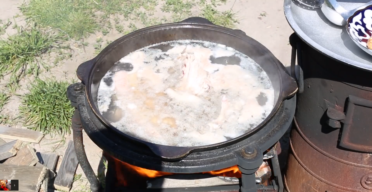 Сегодня я вам хочу рассказать про мою фирменную шурпу. И сегодня она до сих пор числится популярным блюдом в нашем ресторане. Для ее приготовления, нам потребуется мясо говядины, желательно с костями, так как в костях самый навар бульона, еще я предпочитаю варить ее на костре, если есть возможность, ведь настоящая шурпа, готовится только в полевых условиях и на костре. И так, поехали: Говядина - 2 кг Помидор - 600 гр Вода - 5 л Болгарский перец - 600 гр Морковь - 600 гр Лук репчатый - 400 гр Чеснок - 1 шт Картофель - 1200 гр Зелень (укроп, петрушка) - по пучку. Соль, перец - по вкусу. 1. Ставим казан на огонь, кладем в него говядину и варим 2-3 часа 2. Пока говядина варится, чистим, моем овощи. 3. В настоящей шурпе, вся нарезка идет крупная, поэтому нарезаем картофель на 4-6 частей, в зависимости от клубня картофеля, лук нарезаем на 4 части, морковь нарезаем полукольцами или кольцами, тоже зависит от размера моркови, болгарский перец нарезаем на крупные дольки, с помидора нужно снять