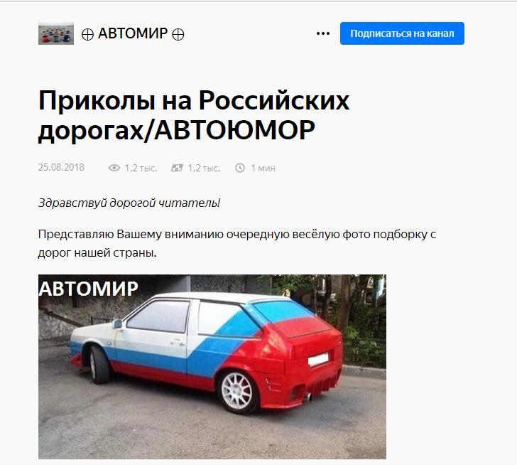А вот вам и очередной нарушитель - канал ⊕ АВТОМИР⊕ https://zen.yandex.ru/content_avto Автор считает, что может вот так вот просто находить в интернете фотографии, писать на них название своего канала и публиковать их под собственным именем. Во даёт! Первая фотография говорит сама за себя - её легко найти в интернете, на внешнем сайте. К тому же, на мой взгляд, название статьи вызывает некоторые вопросы. Что нарушено? И, как мне еще кажется - это кликбейт, но я могу ошибаться. Что еще сказать? На самом деле сама новость - полный бред. То есть, автор написал всего лишь две строчки текста и остальное заполнил фотографиями, взятыми из интернет сети, даже не указав источник. Это 100% бан! Моих знакомых, имеющие каналы в Дзен, которые также выставляли фотографии без текста - безоговорочно банили. Администрация ЯДзен - куда вы смотрите? Ставь лайки и подписывайся на канал, чтобы пресекать подобные нарушения и знать нарушителей в лицо!