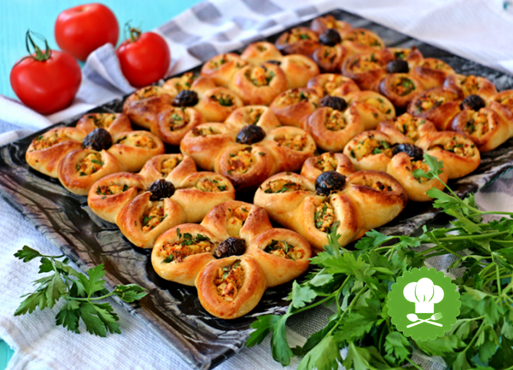 Здравствуйте, хочу поделится с вами простым рецептом не сладкой выпечки. Эта вкуснятина родом из Турции, такая выпечка не только красиво смотрится на столе, но и очень вкусная. Ингредиенты: Для теста: 1 стакан молока (теплый) 1 стакан воды 1 стакан оливкового масла 2 яйца 1,5 ст. ложки сахара 1,5 ч. ложки соли 6-7 чашек муки Для начинки: 3 отварные картофелины 100 гр. сыра 1 пучок петрушки соль, перец по вкусу красный перец (по желанию) черные оливки для украшения Приготовление: 1. Смешайте жидкие ингредиенты для теста, соль, сахар и дрожжи. Добавьте частями муку, чтобы получить тесто в мягкое и податливое (как говорят турки “как мочка уха”) . Накройте его и отложите в сторону. 2. Картошку разомните в пюре, натрите сыр и добавьте в картошку, так же добавьте одно яйцо и мелко порубленную петрушку, посолите и поперчите, все хорошо перемешайте. 3. Разделите тесто на кусочки размером с мандарин, раскатайте в лепешку размером с чайное блюдце. Сделайте четыре надреза ножом с каждой стороны.