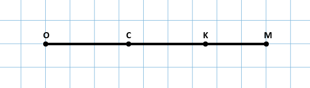 Текст задания: Начертите отрезок OM и отметьте на нем точки C и K. Запишите все получившиеся отрезки с концами в точках O, C, K и M. Решение: Получились следующие отрезки: OC, OK, KM, CK, CM, KM.