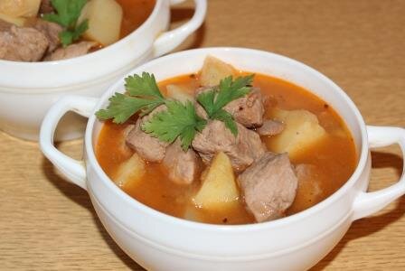 Приготовление: Свинину ополосните холодной водой, удалите жилки, нарежьте крупными кусками. В чаше мультиварки разогрейте 2 столовых ложки растительного масла и зарумяньте свинину, помешивая, в течение 5 минут в режиме «жарка». Пока жарится мясо, лучок очистите и нарежьте мелко. Жарьте ещё минут 7, чтобы лук стал прозрачным, а мясо зарумянилось. В мясо с луком выложите томатную пасту, перемешайте, включите режим «тушение», закройте крышкой и тушите 7 минут. Картошку крупно нарежьте и отправьте к мясу, налейте кипяток так, чтобы вода закрыла мясо. Перемешайте активно, закройте крышку, и забудьте на 40 минут о готовящемся блюде. Добавьте специи, лавровый лист, посолите, смешайте ингредиенты и тушите ещё 15 минут. Затем отключите подогрев и оставьте минут на 15. Разливайте в тарелки, добавляйте сметану и подавайте к столу. Мелко нарежьте зелень и посыпьте тушёную картошку со свининой. Все, тушеное мясо с картошкой в мультиварке приготовилось, ароматное и вкусное, приглашайте