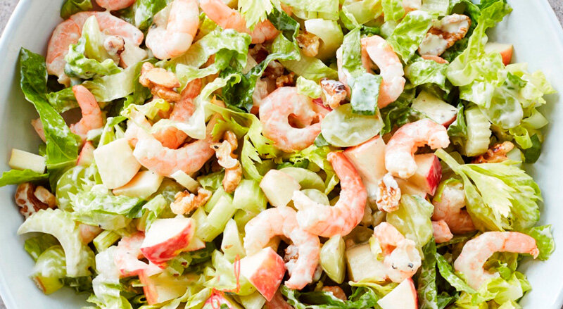 Из яблок и креветок можно приготовить освежающий и очень простой салат, который прекрасно подойдет для летнего меню. Ингредиенты: