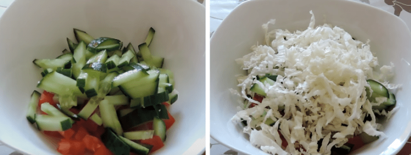 Ингредиенты (берутся произвольно, по вкусу): Приготовление: 1. Помидоры нарезать средними кусочками. Огурцы нарежьте соломкой или другим удобным способом. 2. Пекинскую капусту нашинкуйте соломкой. Сложите овощи в салатник. К ним добавьте маслины (немного). 3. Сыр в этот салат кладется твердый. Его нужно натереть на крупной терке и положить в салатник. 4. Из белого хлеба сделайте заранее сухари. Для этого просто нарежьте хлеб на кубики, посолите и поперчите. Подсушите на сухой сковороде или в духовке до румяной корочки. Сухари в этом салате очень хорошо оттеняют вкус овощей. Чуть позже они напитываются овощным соком, становятся очень вкусными. 4. Заправьте салат майонезом и хорошо перемешайте. Получится новый вкус знакомого греческого салата. Также посолите салат при необходимости.