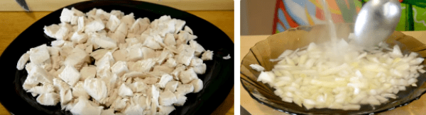 Ингредиенты: Способ приготовления салата с курицей, грибами и сыром. Этот салат можно делать в кольце от разъемной формы для выпечки. В этом случае будут хорошо видны все слои. 1. Куриное филе отварите до готовности. Для этого закипятите воду, курицу помойте. Положите мясо в кипящую воду, варите 30 минут под закрытой крышкой при слабом кипении. В воду также положите перец горошком и лавровый лист для аромата. Посолите за 5 минут до готовности. Сваренное филе охладите и порежьте на кубики. Это будет первый слой салата, который выложите равномерно на блюде. Сверху на курицу нанесите майонез сеточкой. Такое нанесение позволит сделать салат более нежным и воздушным, а также использовать меньше этого жирного соуса. Если майонез у Вас в пакете, просто немного срежьте угол и выдавливайте майонез тонкими нитями на курицу. Можно также использовать кондитерский мешок или шприц. 2. Лук порежьте мелким кубиком. Чтобы лук придал салату новый вкусовой оттенок, необходимо лук замарино