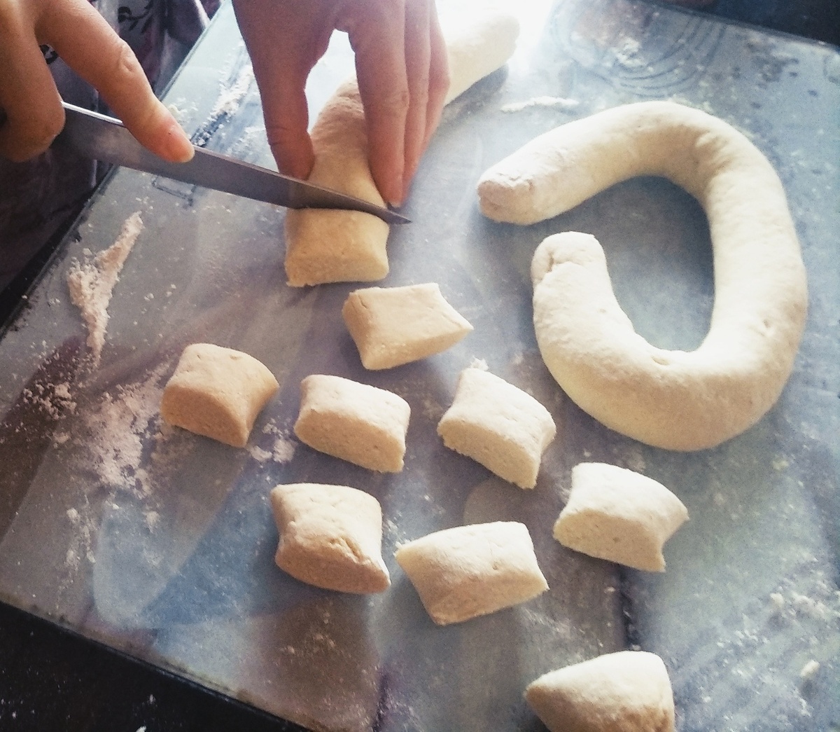 Сюда же 2 столовые ложки сахара, Пол чайной ложки соли и 4-5 cтоловых с горкой ложки муки и, для того чтобы вареники при варке не разваливались, 1 чайная ложка крахмала. Из этих ингредиентов замешивается довольно крутое тесто и скатывается его в плотный жгутик, толщиной сантиметра 2. И ножом нарезаете на дольки. Сразу отправляйте дольки в каcтрюля с кипящей водой. И ждете пока всплывут. Выкладываете шумовкой на тарелку. Но а дальше полет фантазии.