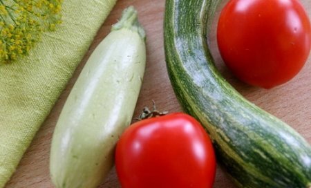 По этому рецепту можно заготавливать квашеные помидоры как с молоденькими кабачками, так и с патиссонами. Перед укладкой овощей банки обязательно стерилизовать. Можно таким способом: подержать вымытую начисто тару над паром из обычного чайника (не электрического) — 5-7 минут вполне хватит. Крышки тоже желательно прокипятить в эмалированной миске в течение 10 минут. Необходимо на 3 килограмма средних помидоров: мелкие кабачки (2 кг), лаврушка (4-6 листиков), зелень сельдерея (1 объемный пучок), кинза (7-8 веточек), чеснок (7 зубков), перец черный в виде горошка (12 шт), соль (150 г).