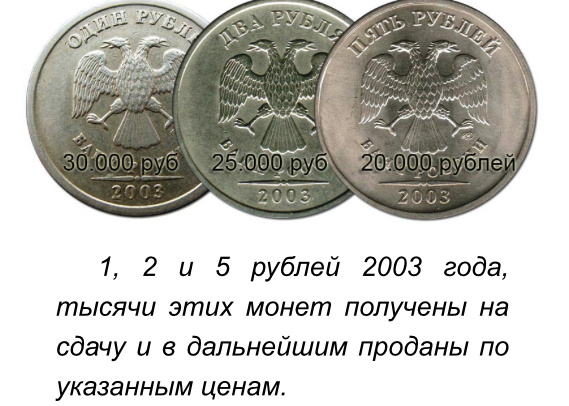 Решил немного отойти от темы канала и рассказать Вам, дорогие читатели про редкие монеты современной России. Самые дорогие монеты России встречающиеся в денежном обращении: Цены на монеты постоянно растут, достигают сейчас 40 000 рублей за 1 рублевую монету и по 20 тысяч за 2 и 5 рублевые. Новые монеты находят постоянно, кто в кубышке раскопает, кто на сдачу получит, но с каждым годом монет все меньше и меньше. Может быть вам улыбнется удача! Посмотрите в кошелёк и найдите желанные цифры 2003. Эти монеты вы можете найти у себя в кошелке или в своей старой копилке, посмотрите внимательно, может вы именно тот счастливчик?