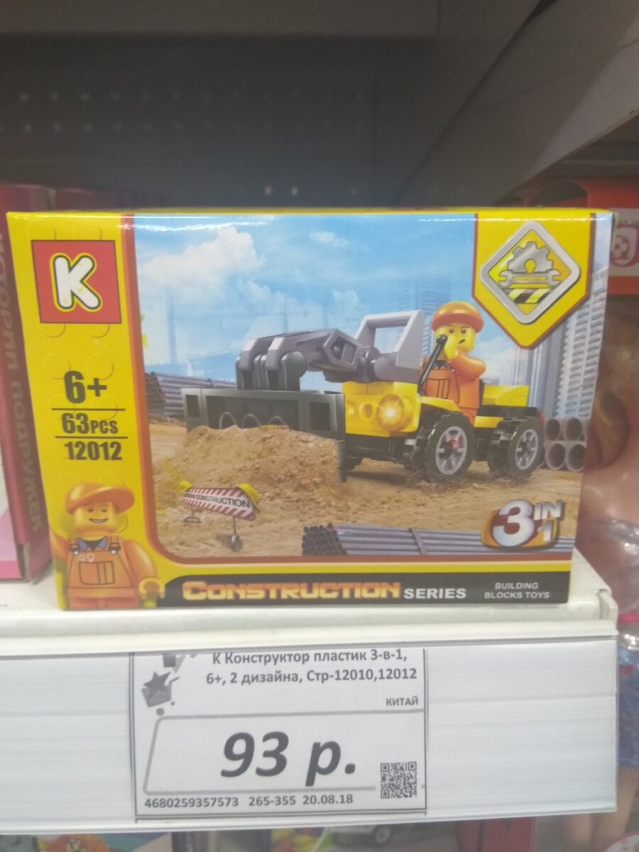 Но это не точно 😉 А по делу это уже не смешно... Я в шоке... Зачем переплачивать за "марку Лего" как минимум в два раза? Решил я взять на пробу нового производителя конструкторов: Цена адекватная, по кошельку не бьет. 63 детали? круто... 3 в одном? ок, нам и одной хватит... Покупал в Галамарте. Детали: В наличии инструкция, это просто великолепно😌 Поехали собирать: Собирая данный конструктор, я получил только положительные эмоции. Колеса резиновые, детали между собой хорошо крепятся. Из косяков это ручки человечка (желтые), они почему то плохо сидят на месте, наверное поэтому в комплекту идут еще 2 запасных (и это плюс), думаю часто теряются. также в комплекте будет еще одна лишняя палка-переключалка🤣 (рычаг) Качество пластика отличное. На совместимость с лего не проверял, но думаю что подойдет. Покупкой доволен как слон. Советую данного производителя к покупке.