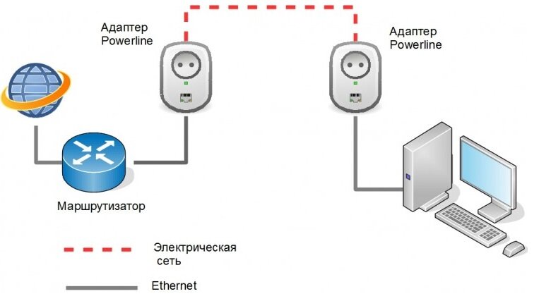 Общий принцип работы представлен на рисунке. Один адаптер, подключается в розетку расположенную возле маршрутизатора, и соединяется с ним витой парой, а другой возле компьютера в другой части дома. Компьютер подключается к адаптеру витой парой.