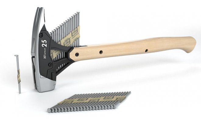 Дизайнер Майкл Янг потратил шесть лет на то, что он сам назвал «безумным научным проектом». Это была попытка создать промежуточное звено между классическим молотком и гвоздеметом. Устройство должно было сочетать функцию зарядки и подачи гвоздей под удар, но при этом работать только за счет мускульной силы и управляться одной рукой. Своей цели дизайнер достиг на 99%, он придумал, протестировал и довел технологию до появления работоспособного прототипа. Однако, несмотря на серьезный интерес, реализация полноценного изделия, в металле, а не только в виде пластиковой 3D-модели, так и не состоялась. Нулевой спрос со стороны коммерческих структур, которые не желают инвестировать в сомнительный продукт. Самозарядный молоток Янг использует те же обоймы гвоздей, что и строительные гвоздеметы. Навершие молотка разделено на три части: ударная поверхность, механизм подачи гвоздей и система выброса одного из них. Сбоку молотка есть кнопка с предохранителем – если повернуть инструмент плашмя и стук