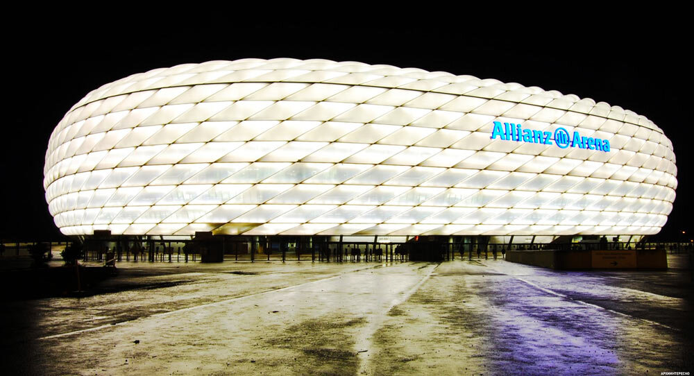 В 1997 году 2 футбольных мюнхенских клуба решили, что их здание нуждается в обновлении. В 2001 году клубы выбрали место для постройки стадиона и через несколько месяце были одобрены планы. Так началось строительство одной из самых больших спортивных арен в мире — стадион Альянц в Мюнхене. Стадион может вместить почти 70 000 человек. Здание как будто сошло со страниц научной фантастики и напоминает собой то ли космический корабль, то ли гигантский микроорганизм. Необычность фасада заключается в том, что треть поверхности оснащена цветными фильтрами с компьютерным управлением и неоновыми трубками. Фасад может менять цвета и принимать раскраску играющих команд. Кроме этого так же возможны различные варианты анимации этих цветов — пульсация, вращение и т.д. Размеры стадиона — 258×227×50 м Стоимость возведения — 340 млн. евро Источники света могут окрашивать в три разных цвета 24 000 м² поверхности фасада Было использовано 120 000 м³ бетона и 22 000 тонны стали Стадион обеспечивает примерно