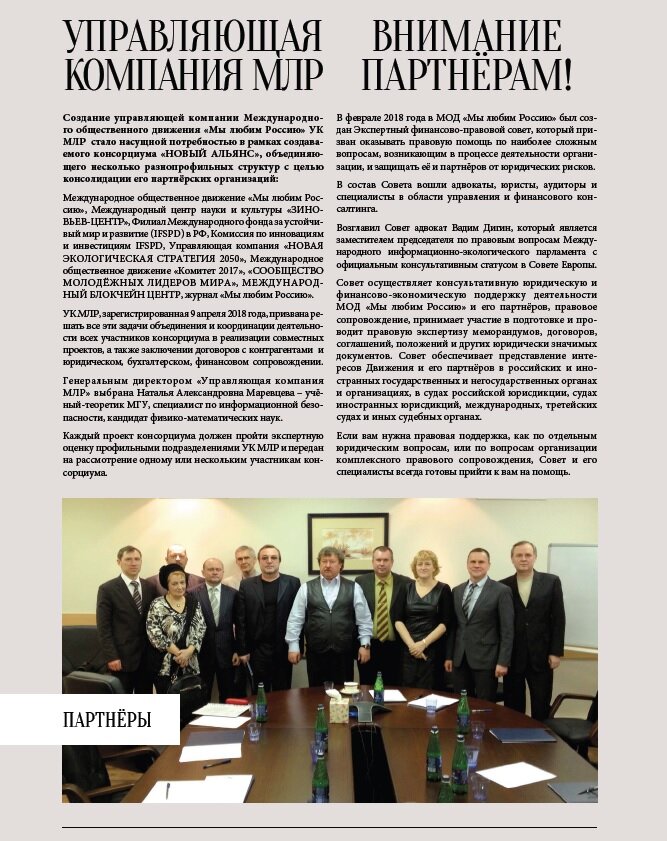 Вступил в Экспертный финансово-правовой совет «Мы любим Россию» (Совет). Назначен Заместителем председателя этого Совета. Вот информация о Совете. В феврале 2018 года в «Мы любим Россию» был создан Экспертный финансово-правовой совет, который призван оказывать правовую помощь по наиболее сложным вопросам, возникающим в процессе деятельности организации, и защищать её и партнёров от юридических рисков. В состав Совета вошли адвокаты, юристы, аудиторы и специалисты в области управления и финансового консалтинга. Идеи создания «Мы любим Россию» и Международный центр науки и культуры «ЗИНОВЬЕВ-ЦЕНТР» следующие. Финансовые интересы и амбиции «сверхэлиты» способны столкнуть лбами целые народы и спровоцировать военные действия.