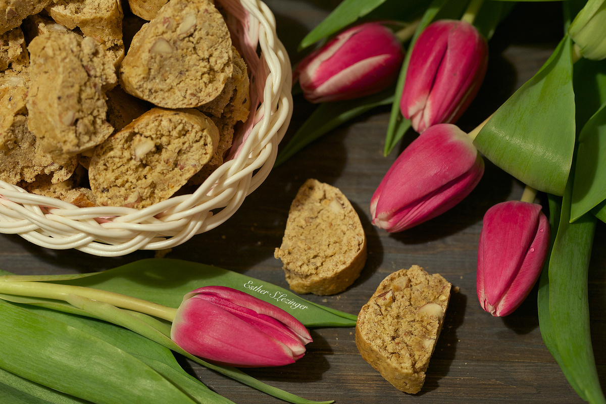 Смешать овсяную и кукурузную муку, добавить яйца, сах.зам., ваниль и разрыхлитель. Замесить тесто. Добавить цедру апельсина. Миндаль порубить ножом, на мелкие кусочки, но не измельчать в блендере. Добавить орехи в тесто. Все еще раз хорошо перемешать. Слепить небольшие колбаски, смазать их белком и отправить на 20 минут в разогретую до 180 градусов духовку. Когда колбаски пропекутся, достать их, нарезать под углом, снова выложить на противень и подсушить в духовке в течение 5-7 минут.