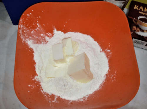 Творожное печенье: способ приготовления. Возьмите миску, в которой будете замешивать тесто. Просейте в нее муку через сито, чтобы тесто получилось более воздушным. В муку добавьте разрыхлитель теста, перемешайте. Масло порежьте кусочками в муку. Теперь чистыми руками перетрите масло с мукой в крошку. Просто берите и двумя руками смешивайте эти компоненты. В масляную крошку положите творог. Замесите тесто, которое получается достаточно плотным. Замотайте тесто в пленку и отправьте в холодильник на 30 минут или в морозилку на 10 минут. Если кладете в морозилку, не прозевайте, а то тесто станет камнем. Тесто нужно охладить. Охлажденное тесто будет хорошо раскатываться, не будет рваться. Пока тесто отдыхает, подготовьте две емкости. В одну насыпьте сахар, в другой смешайте какао с сахаром в равных пропорциях. Я брала какао не такое, как на фото с ингредиентами, а какао-напиток (типа горячего шоколада), в нем какао идет уже с сахаром. Но можно просто смешать самостоятельно как