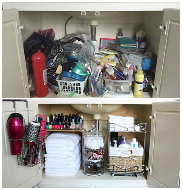 В ванной комнате также собираются баночки, пузыречки, тюбики, которыми мы редко пользуемся или не пользуемся вообще. Такие вещи тоже необходимо или выбросить или раздать. Чтобы не оставалось остатков шампуней и гелей, Не нужно брать новый пока не закончил старый. Существует великое множество органайзеров, разделителей. Не храните лишнее. Ванная должна быть функциональна, зашел взял что нужно, помылся и вышел довольный, а не так чтобы зашел открыл шкаф и пол часа пытаешься найти нужную вещь.