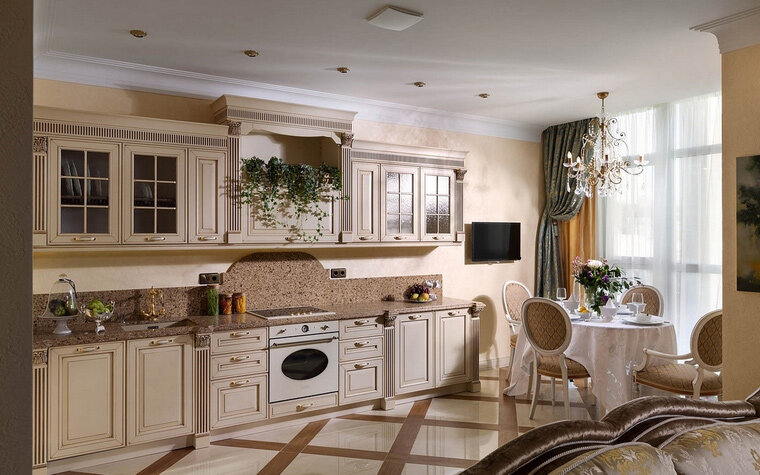 Как оформить кухню-гостиную в итальянском стиле? Смотрим картины старых итальянских мастеров и выбираем полюбившиеся мотивы: мраморные полы, скульптурные камины, красивую лепнину, а также большое пространство, мягкую золотистую гамму и обязательно что-нибудь из классического искусства. Автор проекта: Алеся Сахно Автор проекта: Уютная квартира Фотограф: Михаил Степанов