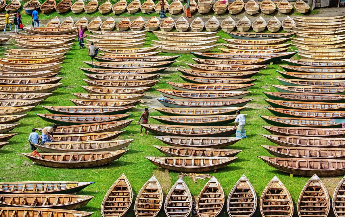 Сотни маленьких деревянных лодок выстроены рядами для продажи на рынке в Маникгандже в Бангладеш. Местные жители готовятся к сезону муссонов: они покупают лодки, чтобы добраться до работы, когда улицы затопит. Одна лодка стоит примерно 22 доллара.