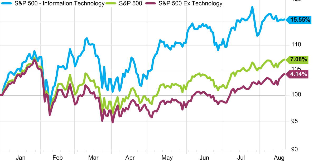 В этом году, пожалуй, все основные американские компании из сектора хайтека, кроме фейсбука (погряз в скандалах) радовали инвесторов ростом доходов и , соответственно, цен акций, а многие аналитики видят именно в этом главную угрозу для рынка. IT-сектор составляет 25% от индекса S&P 500, и, понятное дело, даже небольшая коррекция в нём в моменте обрушивает рынок. Хайтек стал главным драйвером уверенного посткризисного роста, но действительно ли только ему рынок обязан новыми историческими максимумами на фондовом рынке (которые вчера, кстати, опять обновились)? Разберём всё по полочкам. На графике видим, что IT-сектор с начала года в 2 раза обогнал S&P 500, и 15,5% на хайтеке за полгода-это не шутка. На самом деле всё ещё страшнее, т.к. AMAZON и Netflix, относятся к потребительскому сектору, а они выросли на 63% и 79% за год. Какой бы был разрыв, если бы эти два гиганта по праву входили бы IT-сектор? Теперь посмотрим соотношение этих двух индексов по показателю P/E (цена/доход) на гр