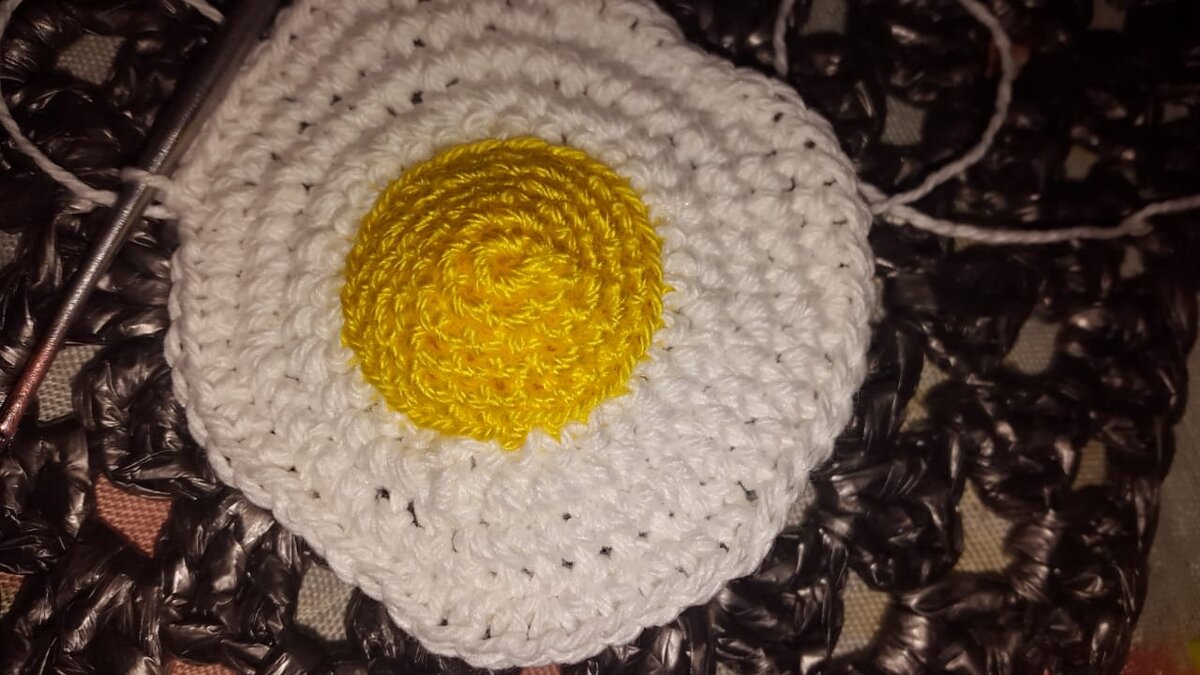 Взялась я вязать продукты питания крючком. Все бывает когда-то в первый раз. Это для меня впервые. А все началось с просьбы нашей воспитательницы, за что ей огромное спасибо. Так как это хорошая идея для моего развития и улучшения опыта. Да и хочется с вами друзья делится чем то новым и интересным. Надеюсь, что эта статья и дальнейшие работы вам пригодятся и будут полезны. И первое что я связала это яичница Итак нам понадобится совсем немного наполнителя, крючек нужного размера, хлопковые нитки жёлтого и белого цвета. Начинаем вязать с желтка. Делаем 4 воздушных петли и смыкаем в круг 1 р. - 6 столбиков без накида в кольцо из четырёх воздушных петель. 2 р. - 2 столбика без накида в каждый столбик предыдущего ряда (12 ) 3 р. - 12 столбиков без накида 4 р. -в каждый третий столбик без накида 2 столбика в одно основанием (16 ) 5 р. - в каждый второй столбик без накида 2 столбика с одним основанием (24 ) 6 р. - 24 столбика без накида Вяжем такие две детали из жёлтой пряж