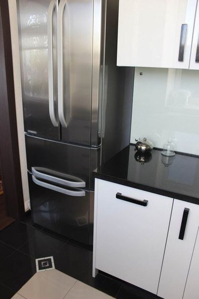 Стоимость только гарнитура с техникой — 5,5 тыс долларов. На мой взгляд, это слишком дорого. Можно было бы уложиться и в меньшую сумму. Но это я так, завидую. У меня в меньшую сумму обошелся капитальный ремонт всей квартиры. Кухню проектировал хозяин самостоятельно. Боялся, что черный цвет на небольшом пространстве будет плохо смотреться. В особенности переживал за потолок. Но нет, напротив, черный глянцевый потолок сработал на расширение пространства. Рассмотрим расположение мебели и техники При входе стоит большой холодильник. Далее НИЗ Верх Отдельно в углу стоят два шкафчика. Сверху висит угловой шкафчик. В общем целом получилось 1)