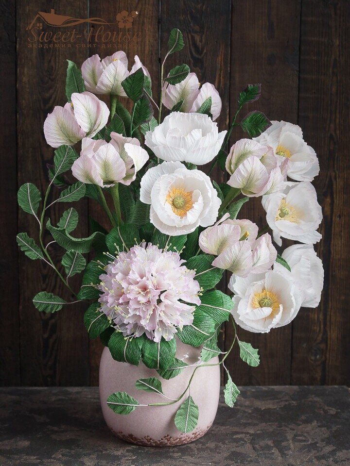 Эльвира очень практичный человек. Идя на курс она точно понимала, зачем ей эта композиция, куда она ее поставит, какая должна быть форма, ваза. Она проанализировала работы предыдущего курса, выбрала лучшие элементы, расцветку и тд.
