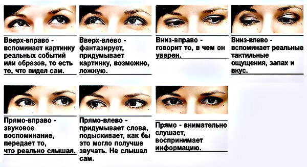 Можно ли прочитать мысли другого человека по глазам? Мы точно не можем узнать, какие образы он представляет в своей голове, но мы можем понять, какие эмоции испытывает человек в этот момент, о чем молчит, как реагирует на нас и на наше окружение. Не существует подтверждения теории о том, что взгляд в определенную сторону свидетельствует об определенных мыслях человека. Но есть ряд физиологических проявлений эмоционального состояния, которые мы не в силах контролировать, например, размер наших зрачков. ЗРАЧКИ В расширении и сужении зрачков задействованы сложные физиологические процессы, эта реакция организма не поддается нашему контролю, поэтому, зрачки никогда не врут. А мы можем воспользоваться этим знанием в своих целях, используя всю нашу наблюдательность. Зрачки имеют свойство расширяться, когда нам страшно, а сужаться во время сна, покоя, усталости , боли и подавленного самочувствия. Также на размер зрачков может влиять сила напряжения лобных мышц либо желание/нежелание человек