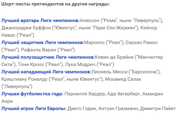 Первая тройка кандидатов на звание лучшего футболиста УЕФА это - Модрич, Роналду и Салах. Интересно что в первую тройку не попал всем известный Лионель Месси, думаю это было справедливо, ведь ничего выдающегося в этом году от него не было. Также даже в ТОП - 10 не попал Неймар. 30 августа во время жеребьёвки группового этапа в Монако, будут объявлены обладатели индивидуальных наград по позициям в УЕФА - 2017/18 и конечно же будут названы лучший футболист и лучшая футболистка прошедшего года. Шорт-лист из трех претендентов Лука Модрич ("Реал" и сборная Хорватии) На первом месте претендентов разместился победитель Лиги Чемпионов и финалист Чемпионата Мира 2018. Также заслуженый обладатель награды лучшего игрока ЧМ-2018. Криштиану Роналду ("Реал"/"Ювентус" и сборная Португалии) Пять рекордных побед в Лиге чемпионов и в шестой раз подряд стал лучшим бомбардиром турнира. Мохамед Салах ("Ливерпуль" и сборная Египта) Финалист Лиги чемпионов, который в дебютном сезоне в "Ливерпуле" устано