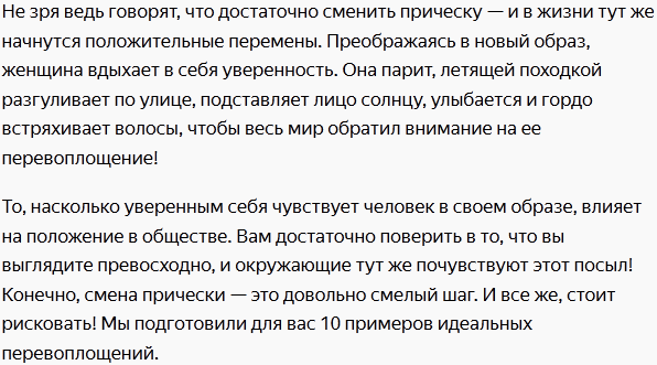 1. Смелый шаг, который того стоил! 2. Поразительно, она ведь даже стала выглядеть моложе! 3. Милая опрятность пошла ей на пользу. 4. Да, длинные волосы — не всегда выигрышный вариант. 5. Правильное решение! 6. Тот случай, когда челка очень красит! 7. Она просто красотка! 8. Короткие стрижки нынче в моде. 9. Если честно, оба варианта прекрасны! 10. Очень смело!