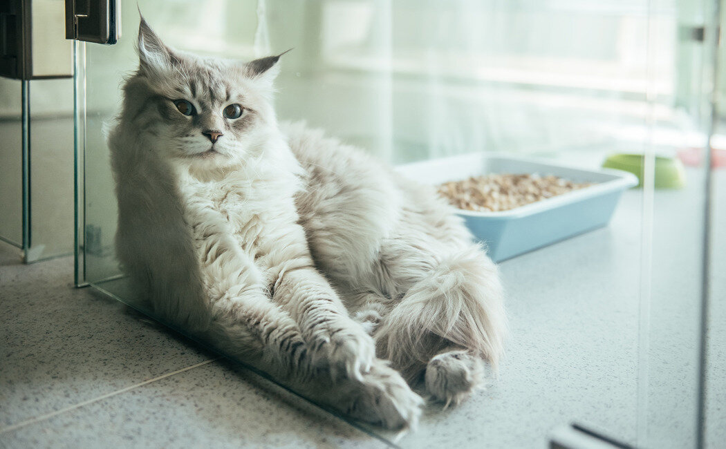 Девять боксов для кошек сделаны из закаленного стекла, а сверху закрыты металлической сеткой, чтобы питомец не мог выбраться наружу. Все боксы имеют по четыре отдельные стеклянные стены и не граничат с соседними, а в пространствах между ними натянуты портьеры — для ограничения видимости.
