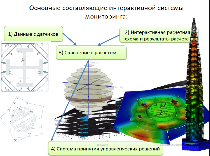 Она основана на постоянном сравнении реальной картины состояния зданий Лахта Центра, основанной на показаниях датчиков, с прогнозируемыми значениями деформаций.